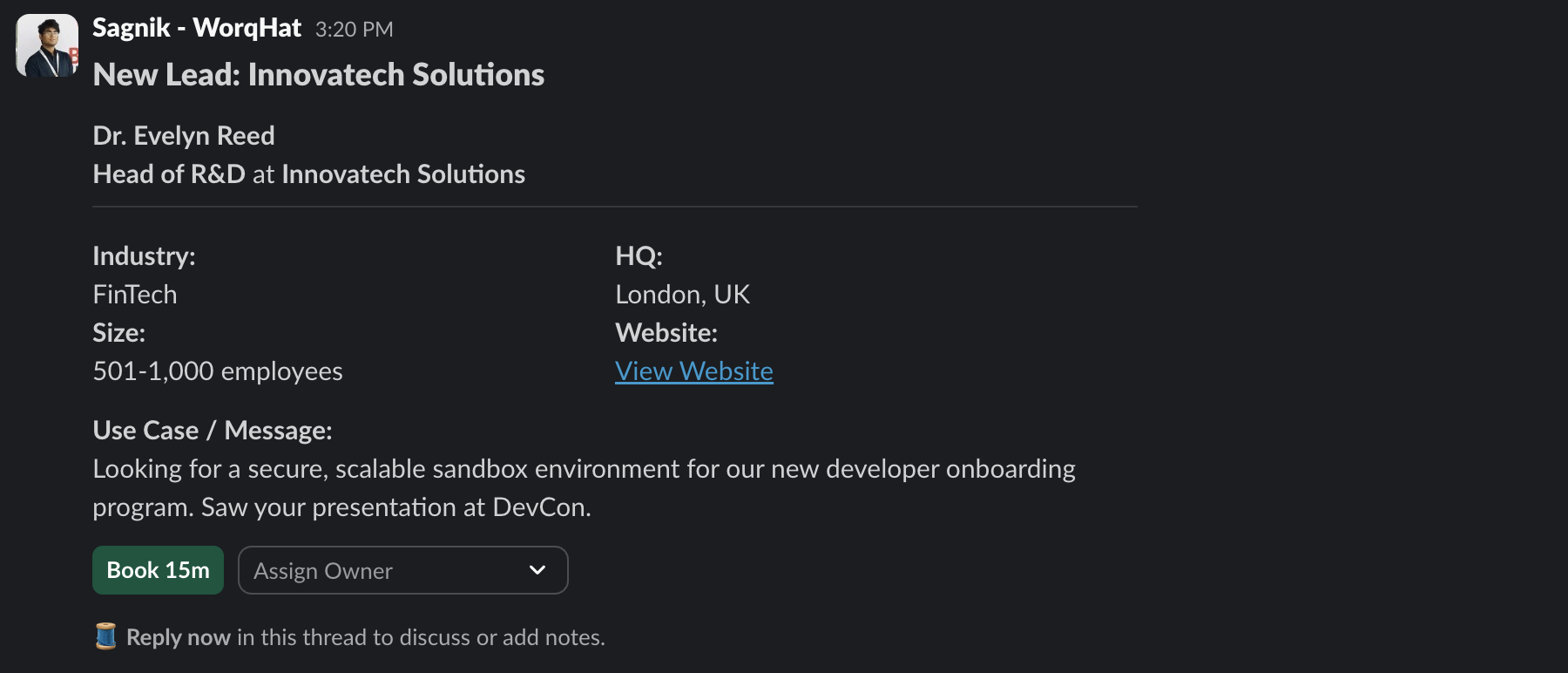 - Slack Notification: Posted a compact lead card with a CTA.